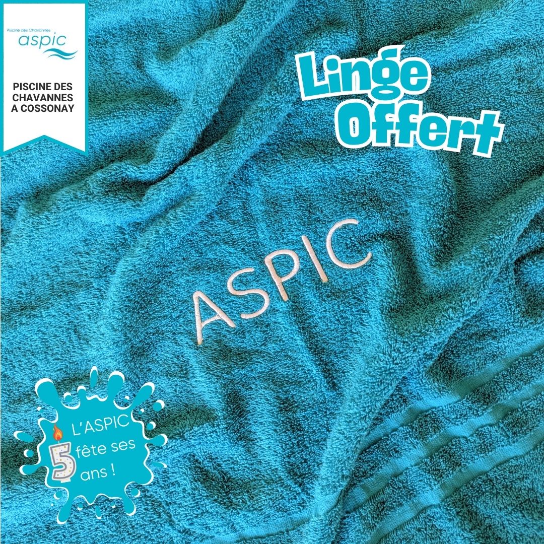 Surprise n°1 : Pour l'achat d'un abonnement annuel piscine ou aqua, recevez ce magnifique linge brodé ASPIC ! Doux et de grande taille, il vous accompagnera dans toutes vos activités aquatiques ! Si vous avez acheté votre abonnement en ligne, venez vite au secrétariat pour le récupérer.