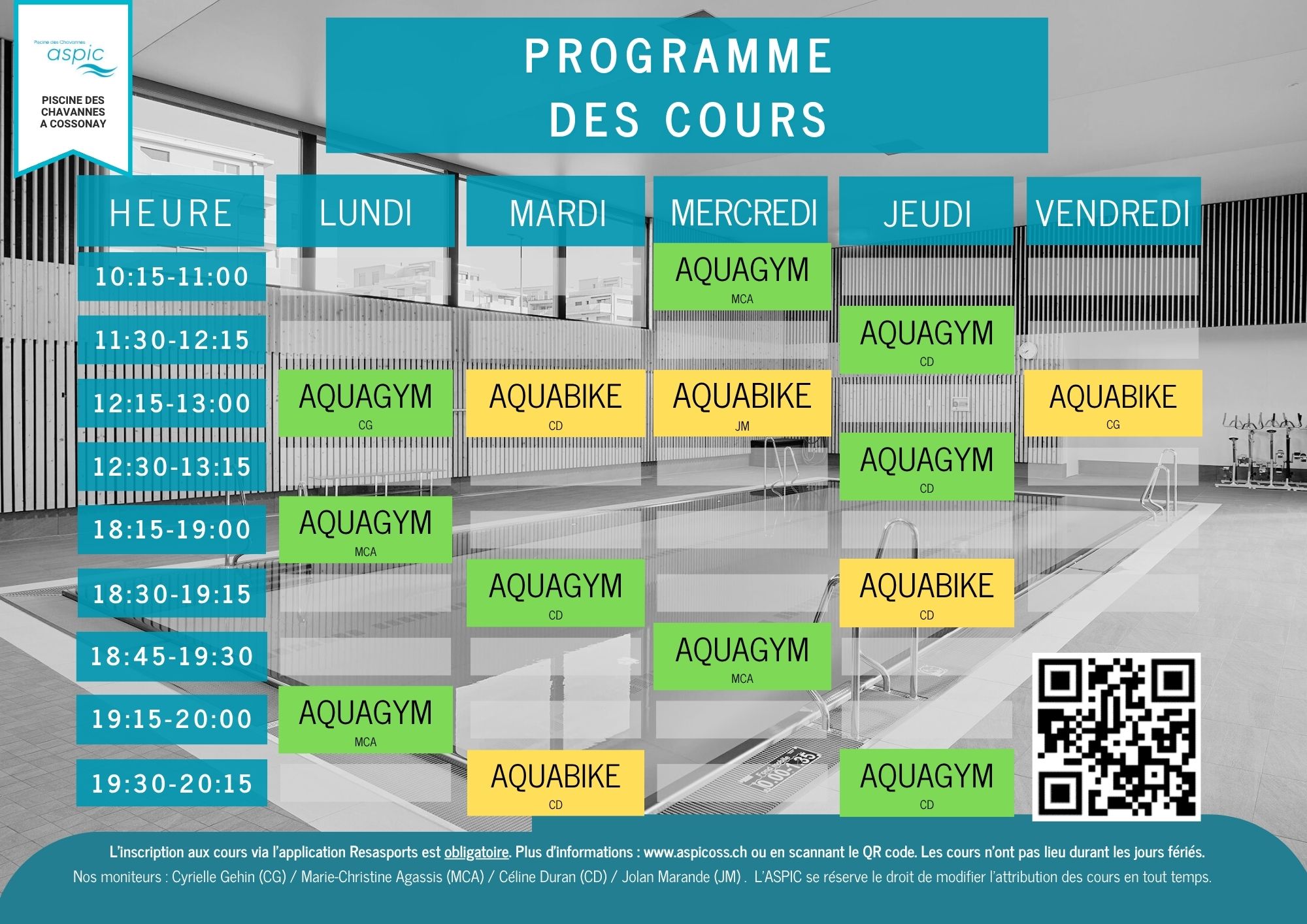 CALENDRIER DES COURS ET HORAIRES D'ÉTÉ : Le calendrier des cours est consultable en bas de page. Attention cependant, lors de l'introduction de l'horaire d'été de la piscine (période des vacances scolaires), le programme des cours est allégé pour s'adapter aux horaires d'ouverture de la piscine. Vous pouvez d'ores et déjà prendre connaissance de ce dernier en cliquant ici.